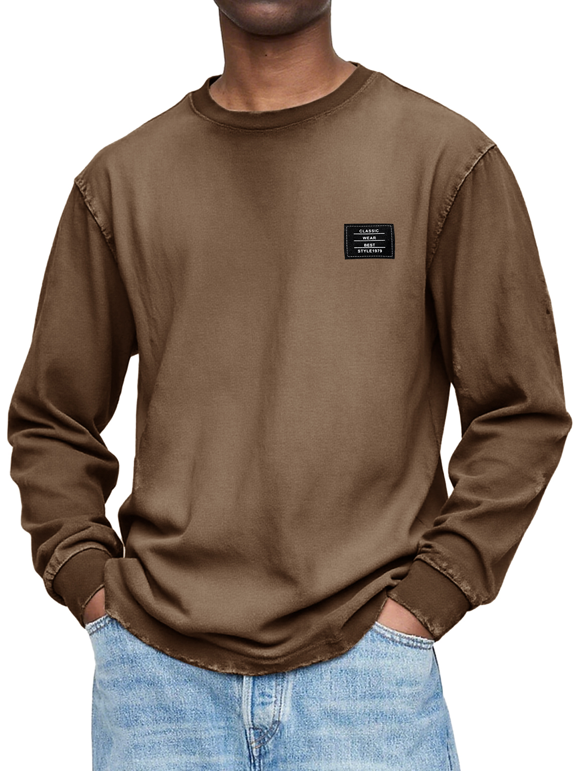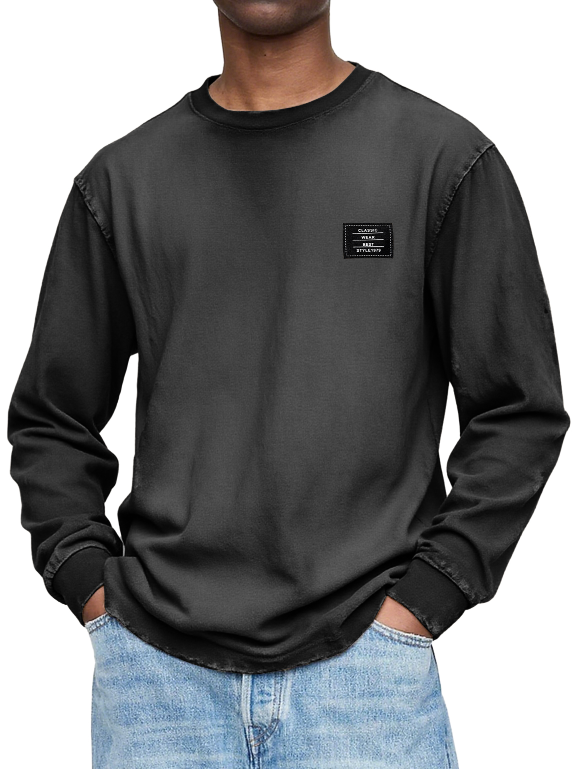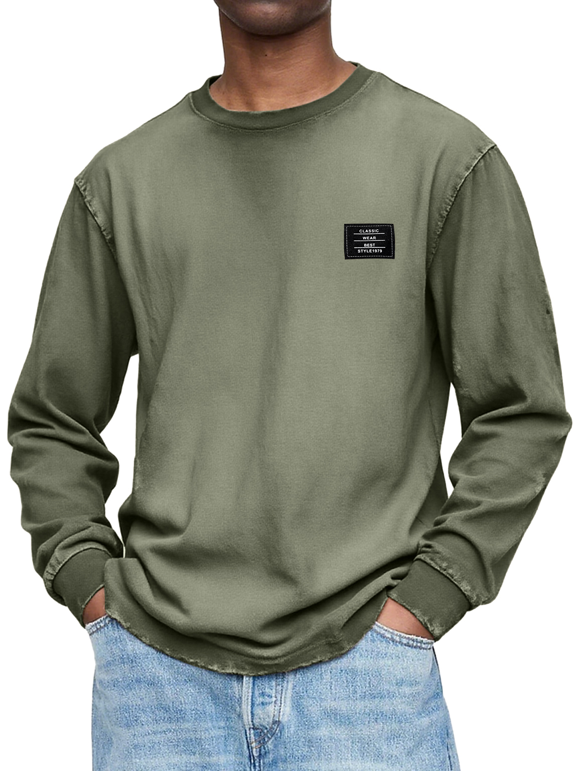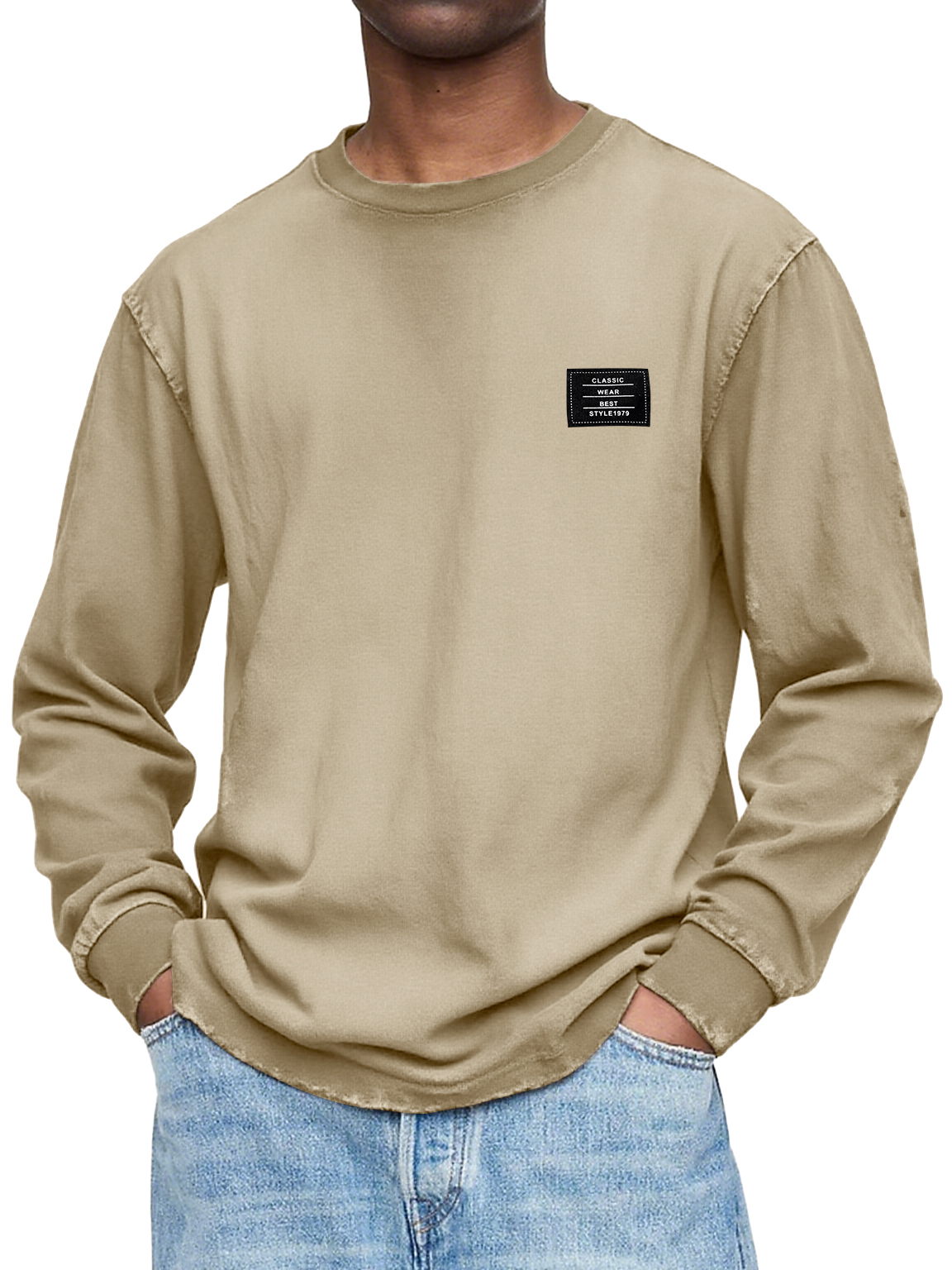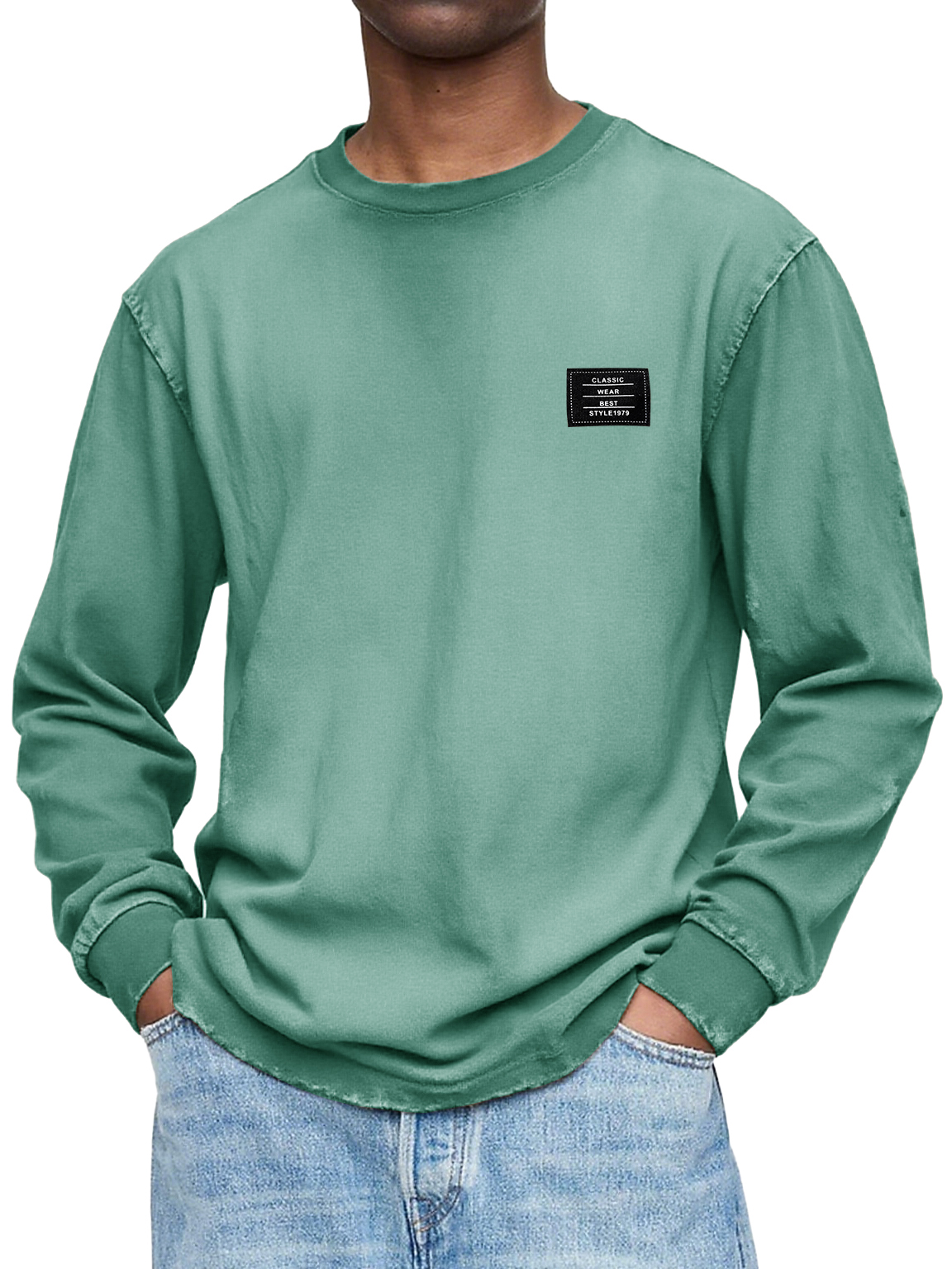 Herren Vintage Casual Gewaschen und Abgenutzt Schweres, Handgefertigtes Besticktes Logo Langarm-T-Shirt